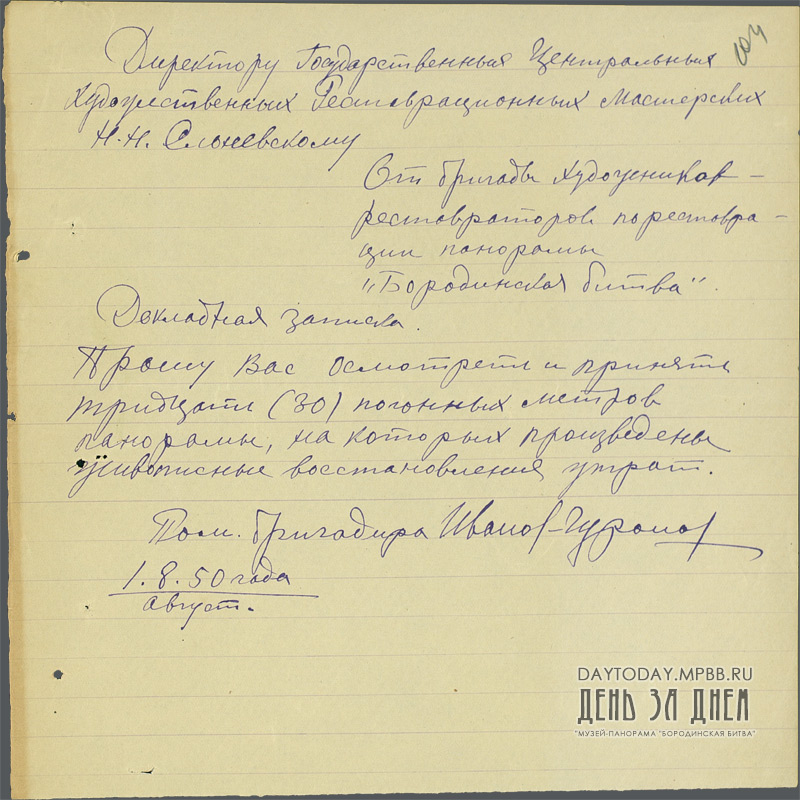 Докладная записка Иванова-Чуронова Слоневскому с просьбой принять 30 погонных метров панорамы «Бородинская битва» на которых произведены живописные восстановления утрат
