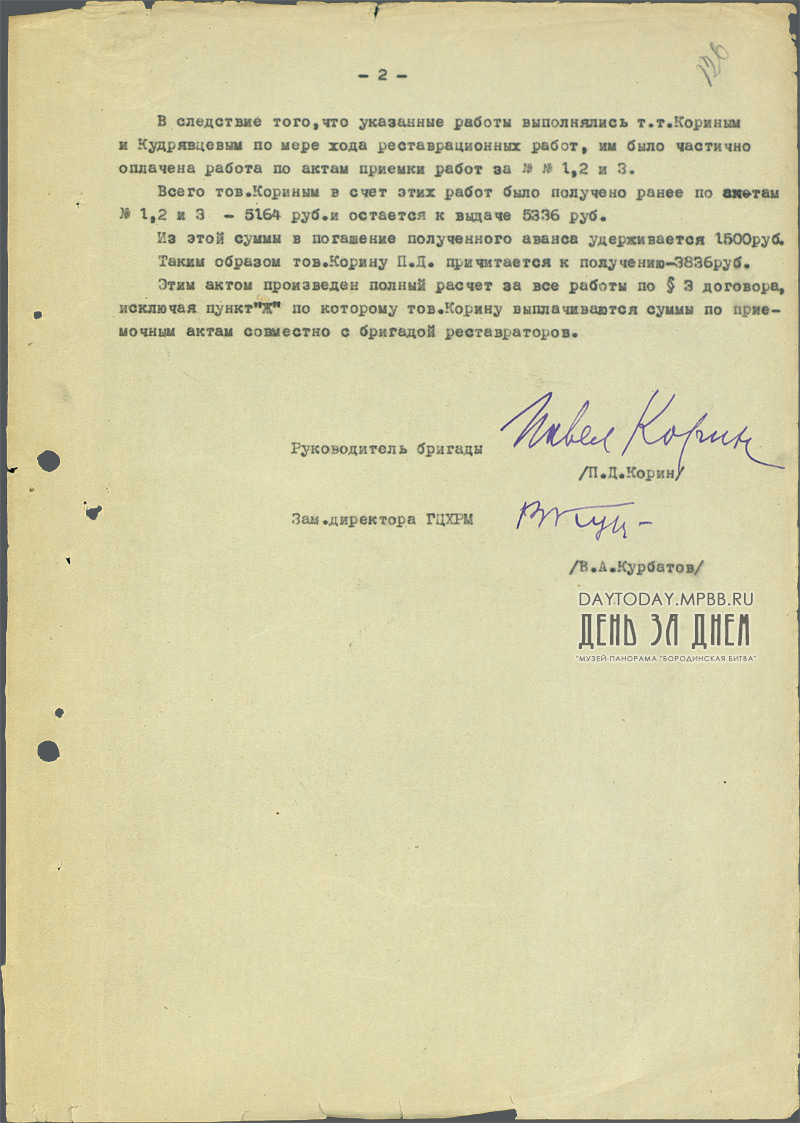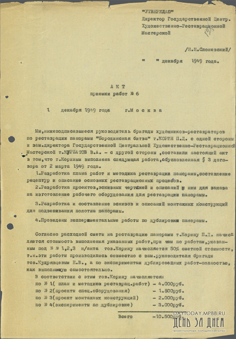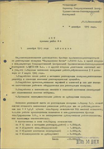 Акт приёмки работ № 6 о работах выполненных П. Кориным по разработке плана работ и методики реставрации панорамы, проектов, эскизных чертежей и описаний для заказа оборудования