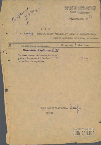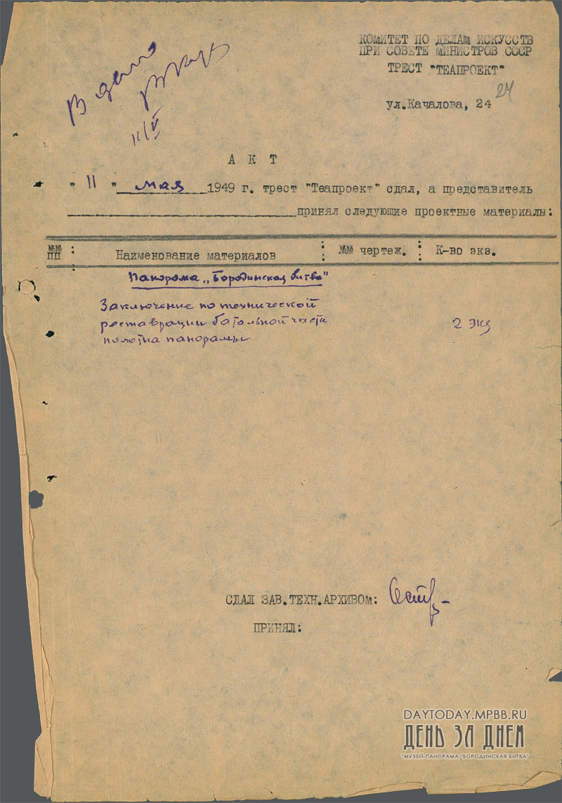 Акт передачи трестом «Теапроект» Заключения по технической реставрации батальной части полотна панорамы «Бородино»