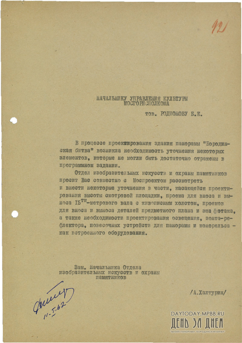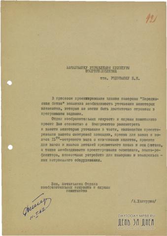 Письмо заместителя начальника Отдела изобразительных искусств и охраны памятников А. Халтурина начальнику Управления культуры Мосгорисполкома Б.Е. Родионову с просьбой внести уточнения в проект здания панорамы, не отраженных в программном задании