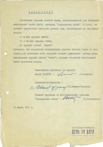 Заключение на определение качества ручного шва на образце льняной ткани, предназначенной для написания неба панорамы «Бородинская битва»