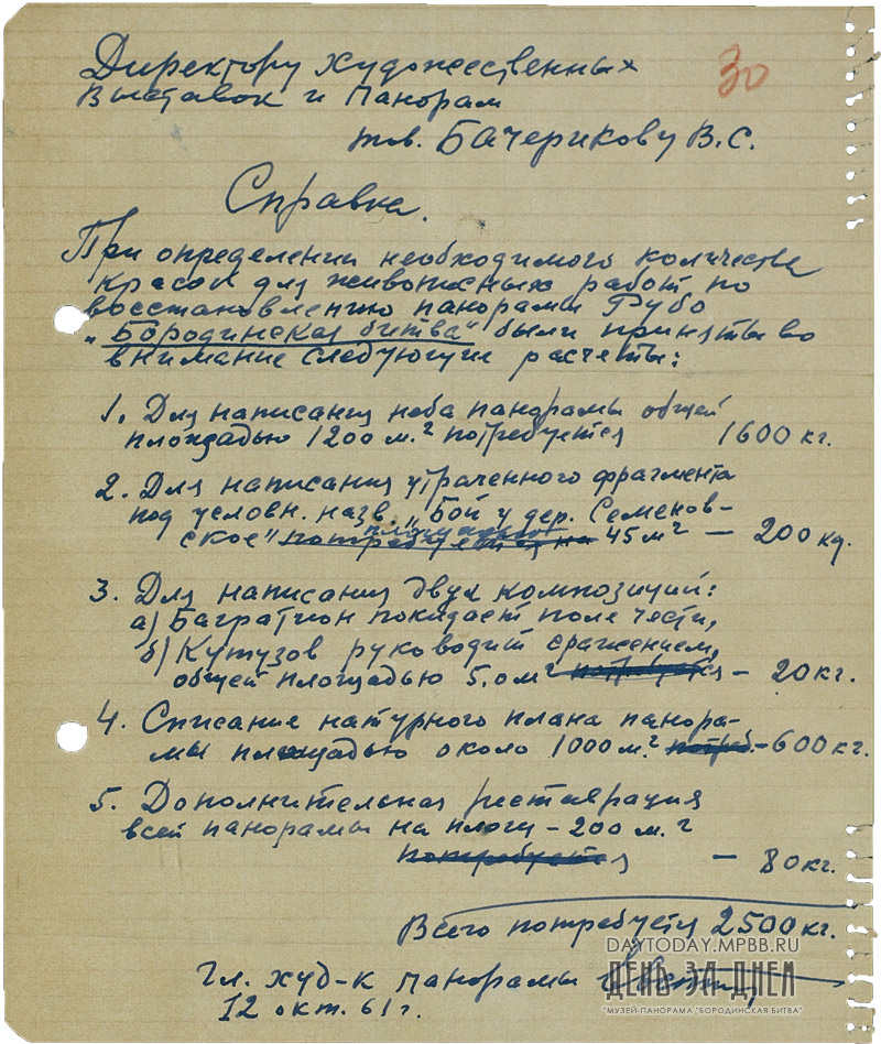 Справка по расчету необходимого количества красок для живописных работ по восстановлению панорамы «Бородинская битва», составленная главным художником панорамы И.В. Естигнеевым