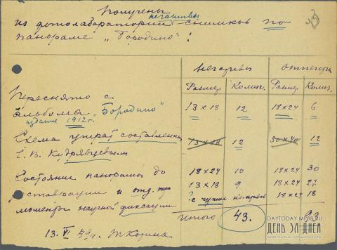 Расписка Т. Кориной на получение из фотолаборатории негативов снимков панорамы «Бородино»