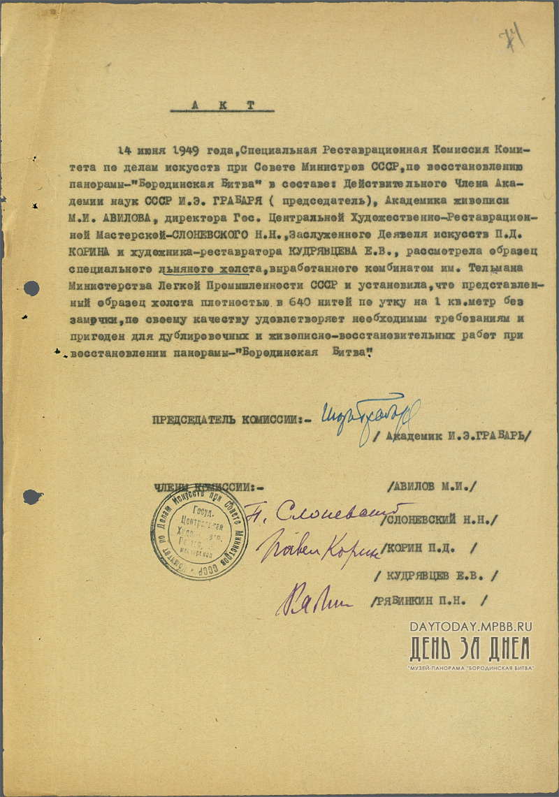 Акт о пригодности специального льняного холста для дублировочных работ при реставрации панорамы