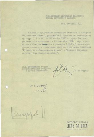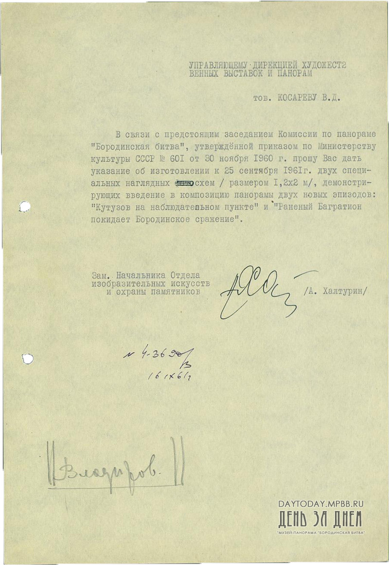 Письмо зам. начальника отдела изобразительных искусств и охраны памятников А.Г. Халтурина управляющему Дирекцией художественных выставок и панорам В. Косареву с просьбой изготовить схемы, демонстрирующие введение в композицию панорамы двух новых эпизодов