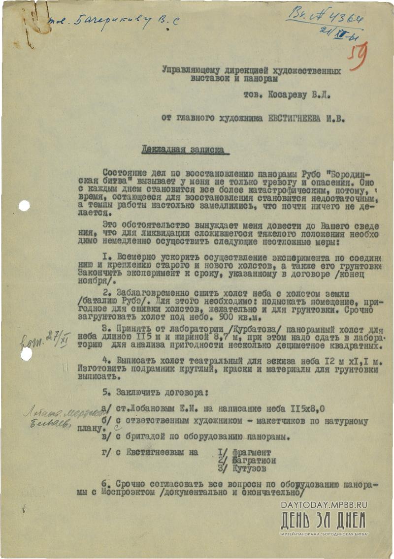 Докладная записка И.В. Евстигнеева управлящему дирекцией художественных выставок и панорам В.Д. Косареву о тяжелом состоянии дел по восстановлению панорамы «Бородинская битва» и о мерах, которые следует предпринять для поправления ситуации