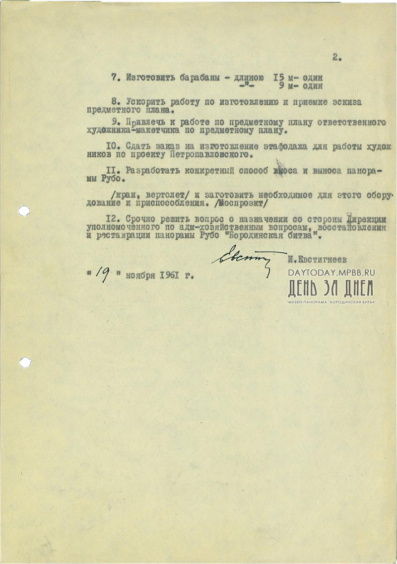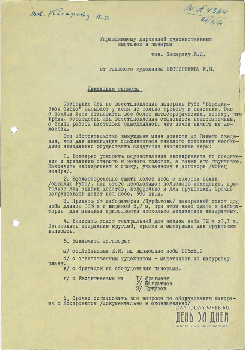 Докладная записка художника И.В. Евтигнеева управляющему Дирекцией художественных выставок и панорам В.Д. Косареву о состоянии дел по восстановлению панорамы «Бородинская битва»