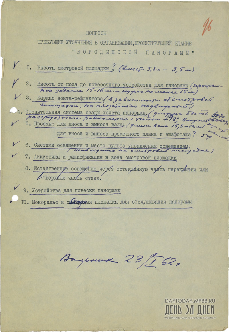 Вопросы, требующие уточнения в организации, проектирующей здание панорамы «Бородинская битва»
