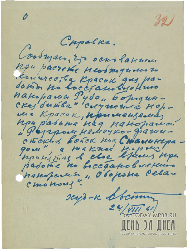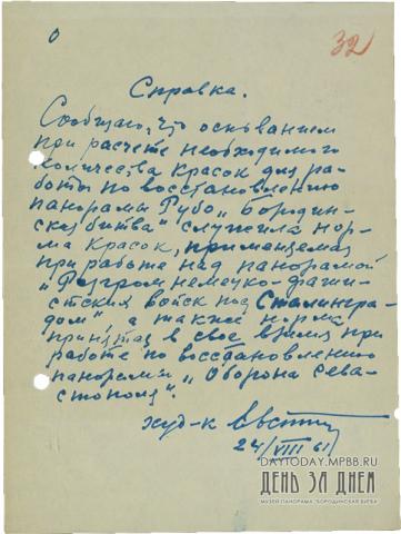 Сообщаю, что основанием при расчете необходимого количества красок для работы по восстановлению панорамы Рубо «Бородинская битва» служила норма красок, применяемая при работе над панорамой «Разгром немецко-фашистских войск под Сталинградом», а также норма принятая в свое время при работе по восстановлению панорамы «Оборона Севастополя».