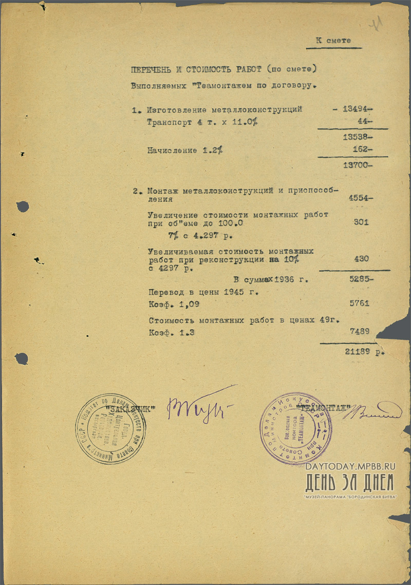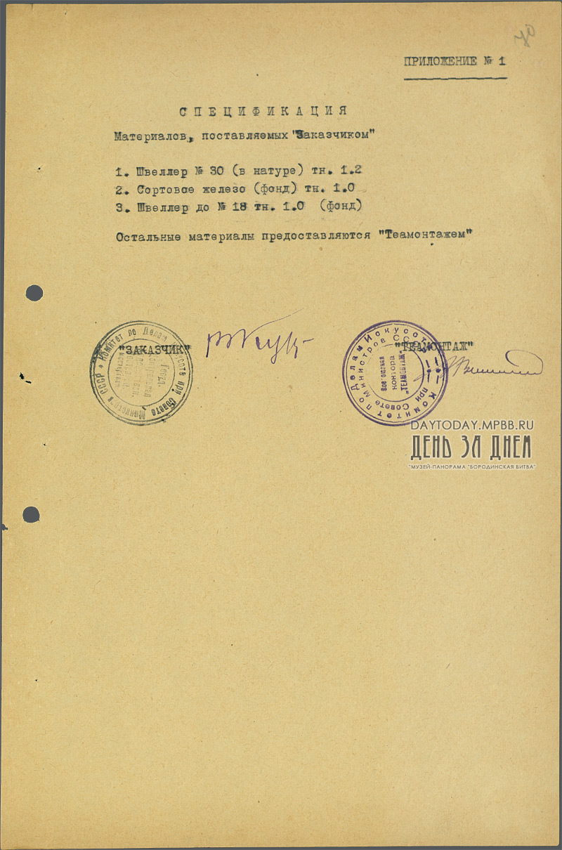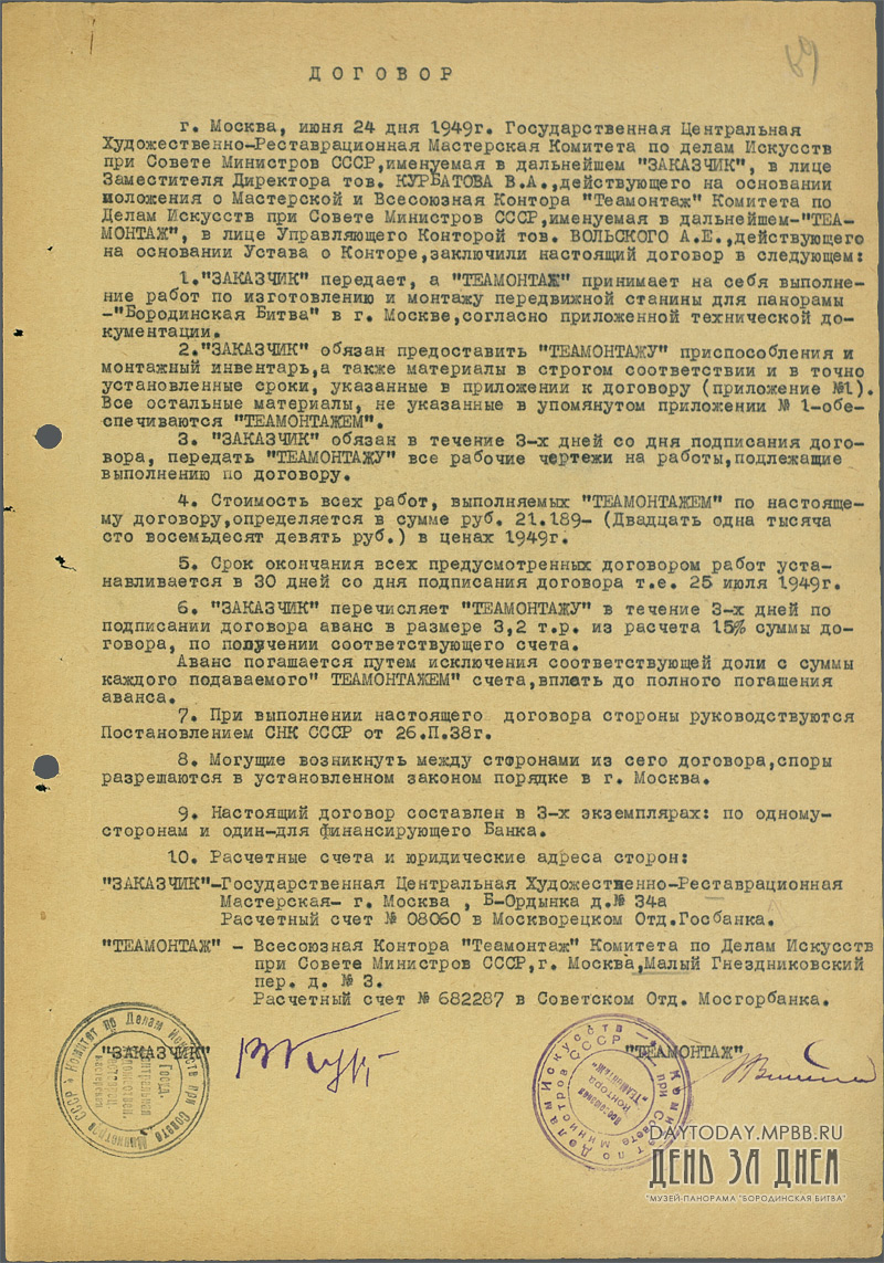 Договор между ГЦХРМ и Всесоюзной конторой «Теамонтаж» об изготовлении и монтаже передвижной станины для панорамы «Бородинская битва»