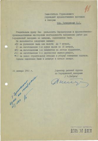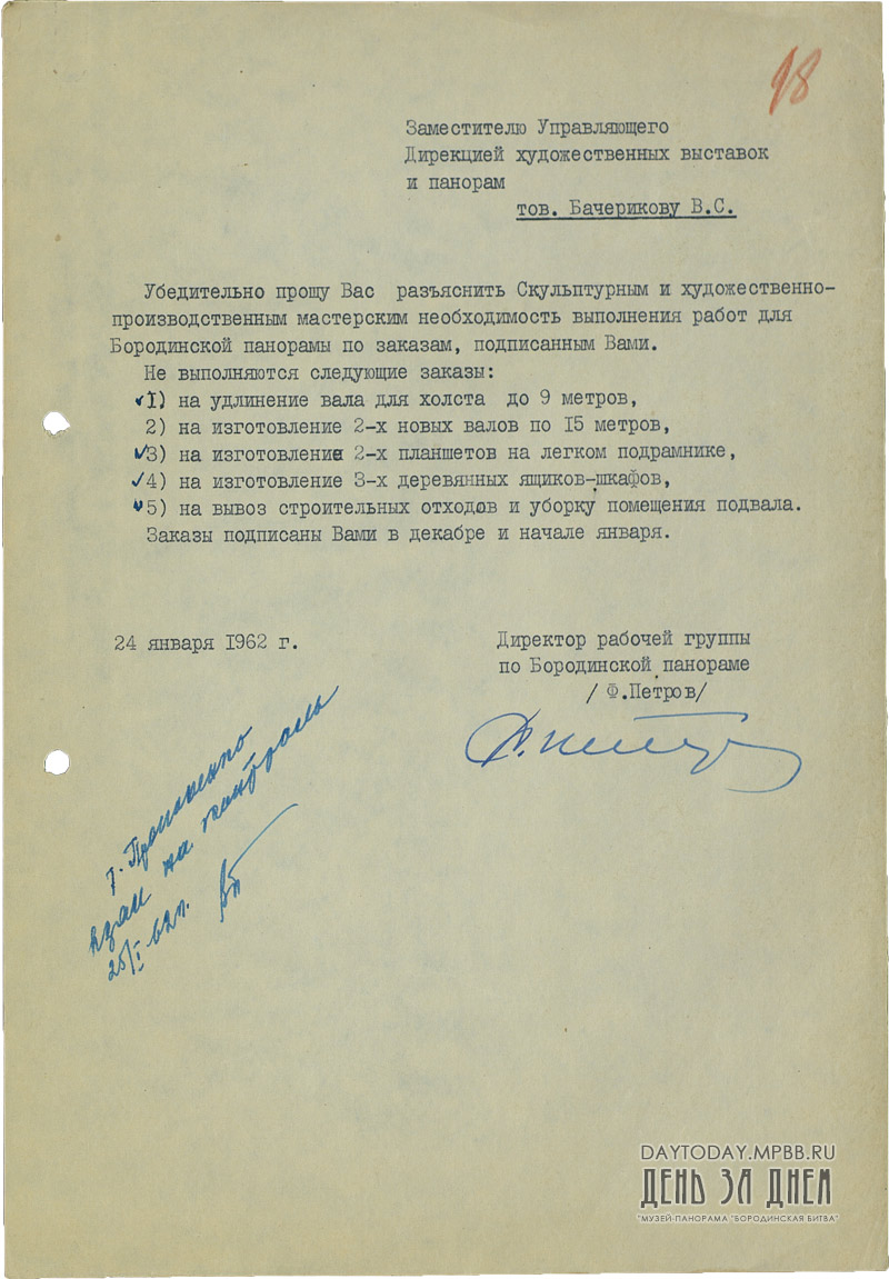 Письмо директора рабочей группы по Бородинской панораме Ф. Петрова В.С. Бачерикову с просьбой воздействовать на Скульптурные и художественно-производственные мастерские не выполняющие заказы для панорамы