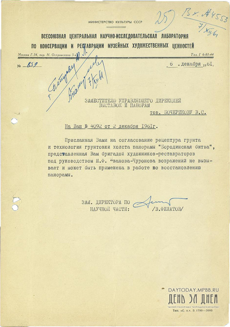 Письмо Всесоюзной Центральной научно-исследовательской лаборатории по консервации и реставрации музейных художественных ценностей в Управление дирекции выставок и панорам о согласовании рецептуры грунта и технологии грунтовки панорамы
