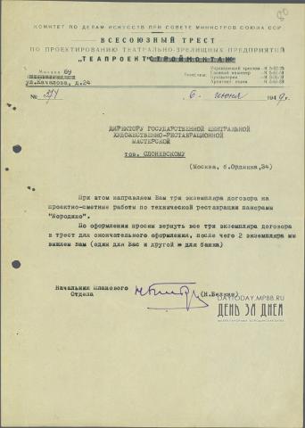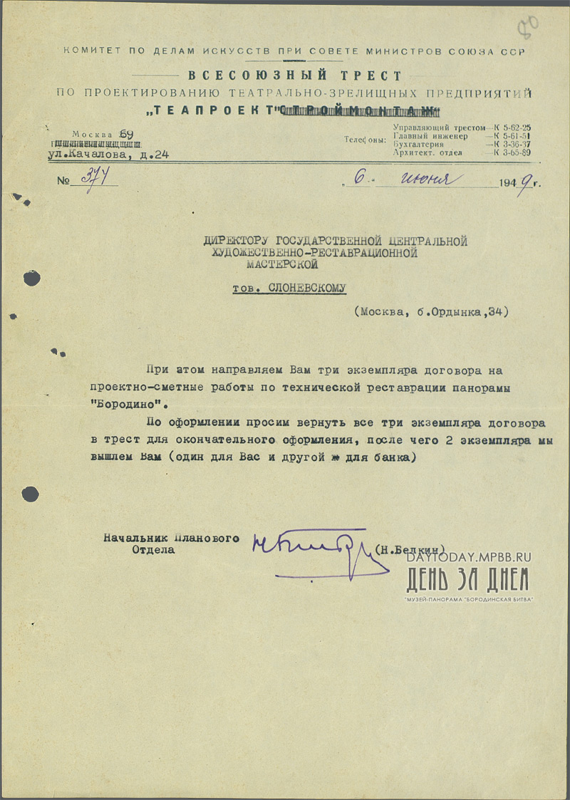 Письмо Н. Белкина Н.Н. Слоневскому об отправке на подпись договора на проектно-сметные работы по технической реставрации панорамы «Бородино»