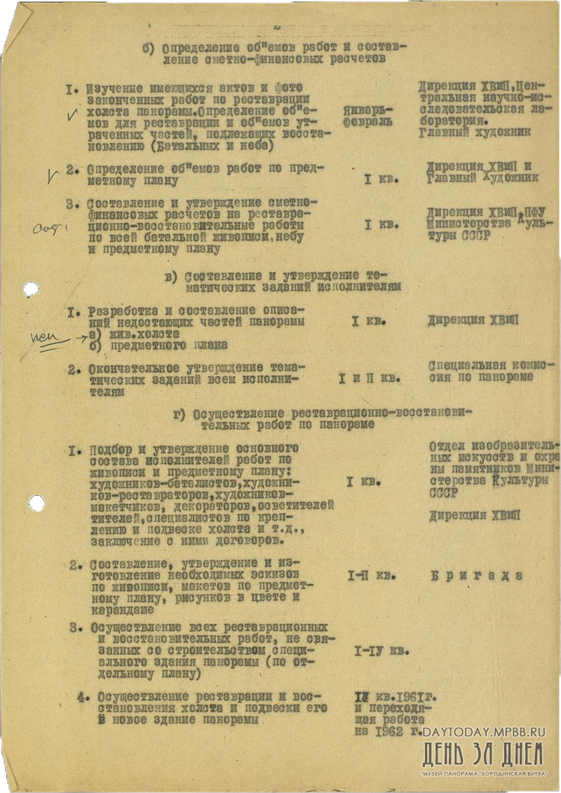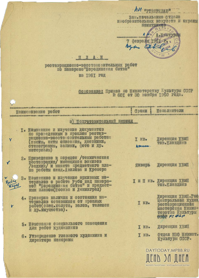 План реставрационно-восстановительных работ по панораме «Бородинская битва» на 1961 год