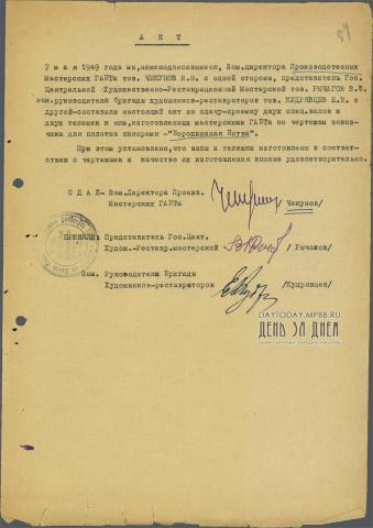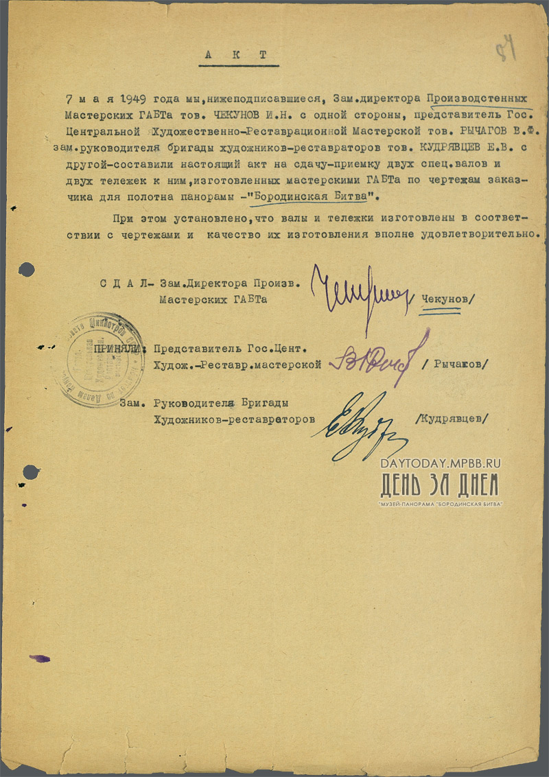Акт приемки двух специальных валов и двух тележек к ним для панорамы «Бородинская битва»