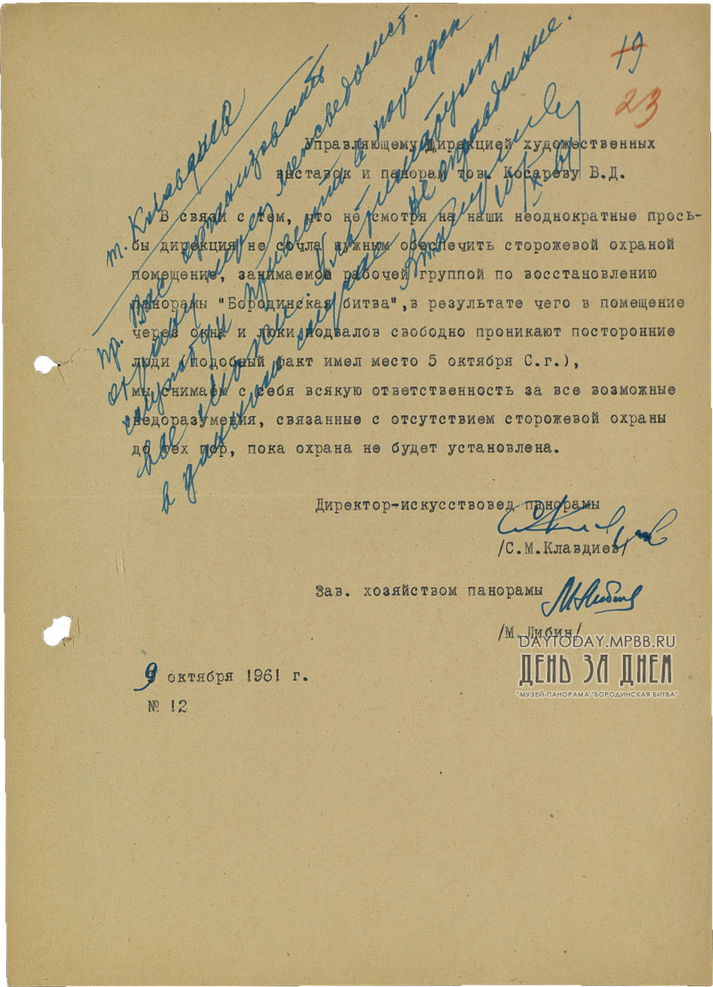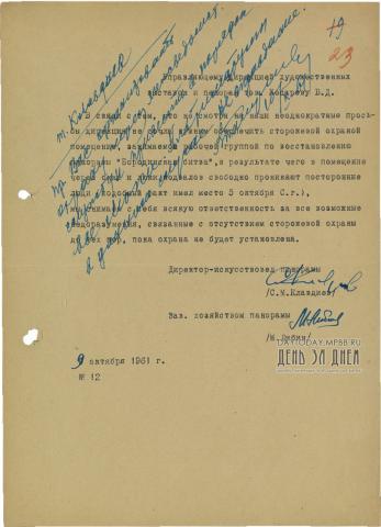 Письмо директора-искусствоведа панорамы С.М. Клавдиева управляющему Дирекцией художественных выставок и панорам В. Косареву по поводу отсутствия охраны в помещении, занимаемой рабочей группой по восстановлению панорамы