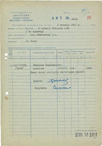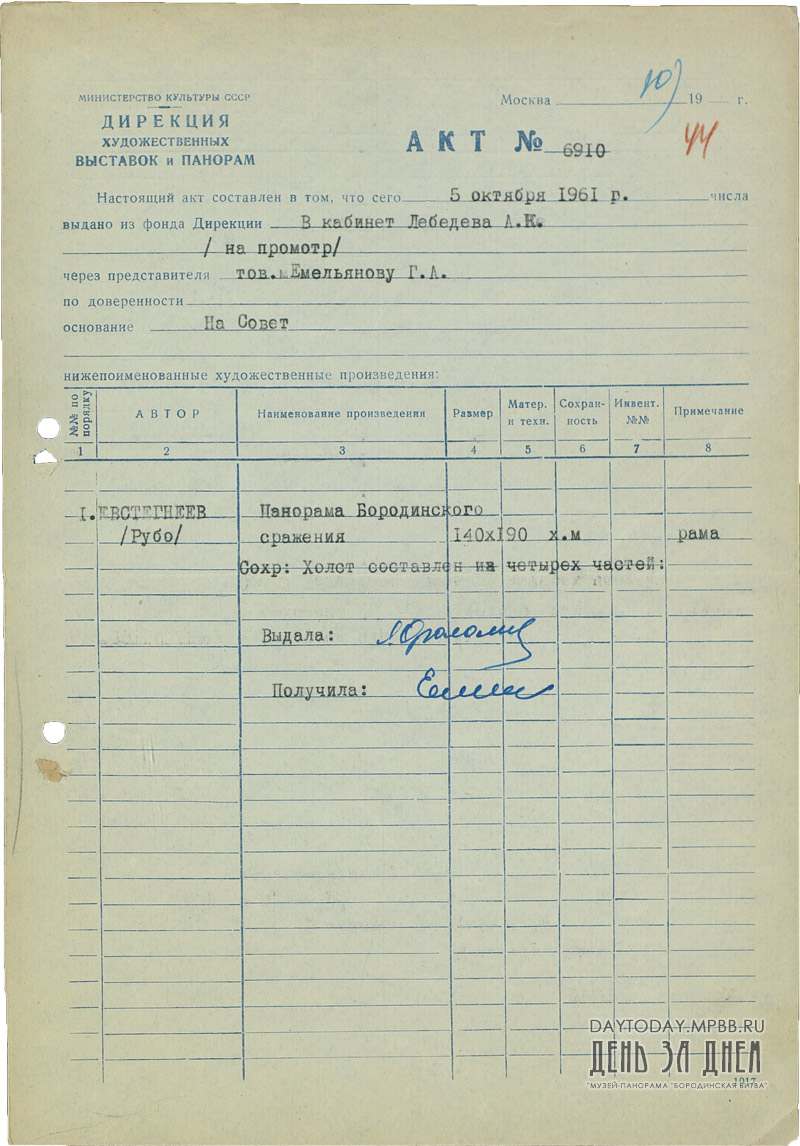 Акт № 6910 о выдаче на Совет эскиза панорамы «Бородинская битва» художника Евстигнеева