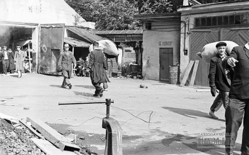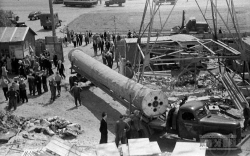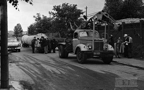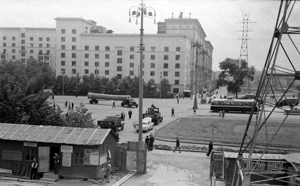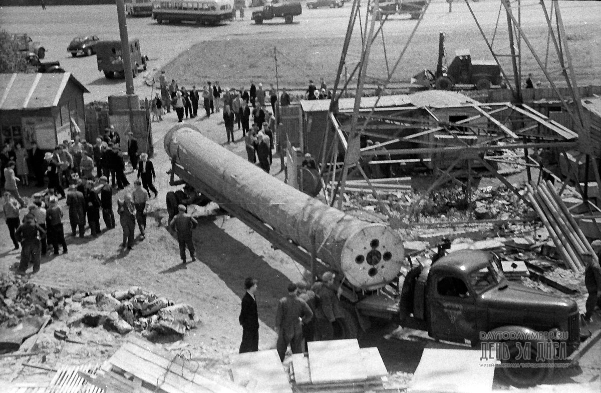 Автопоезд остановился на специально расчищенной площадке у самого здания. Не успели замолчать моторы автомашин, как раздались четкие слова команд. Находившиеся на своих постах в кабинах гигантских башенных кранов крановщики Н. Филоненков и Н. Николаев тросами подцепили металлический каркас вместе с валом и за 10 минут подняли его наверх, а потом точно опустили на крышу бокового зала, к проему в стене.