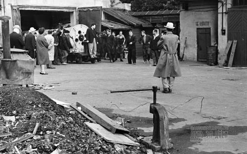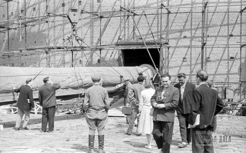 Бригады монтажников, верхолазов и такелажников осторожно втягивают вал через проем внутрь круглого зала. Художники и реставраторы поднялись на только еще начатую строительством смотровую площадку, чтобы наблюдать за ходом работ.
