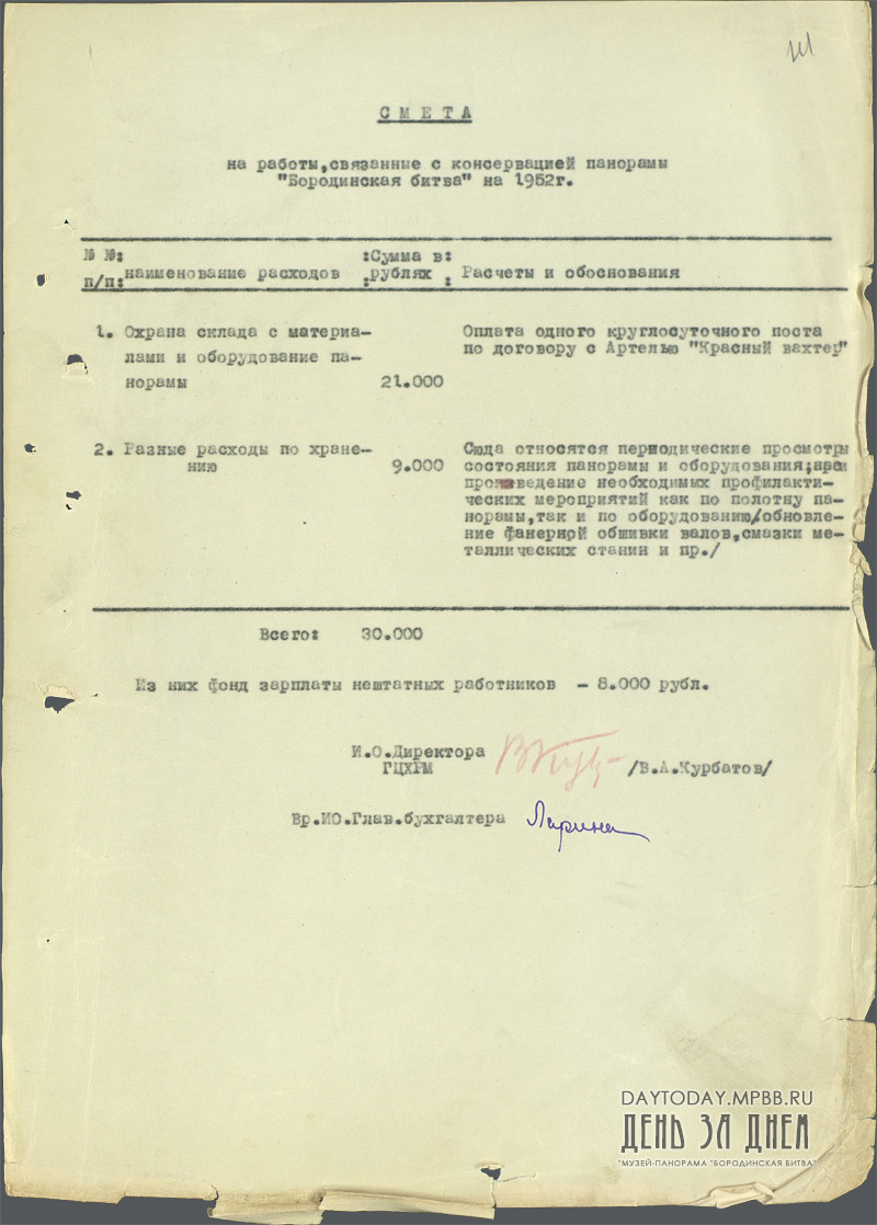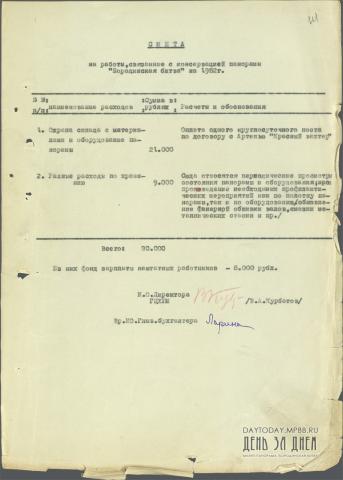 Смета на работы, связанные с консервацией панорамы «Бородинская битва» на 1952 год