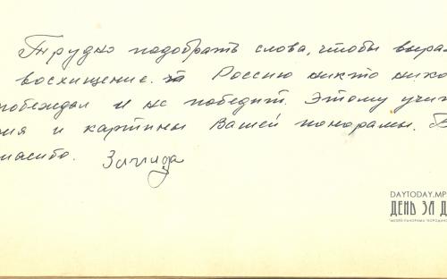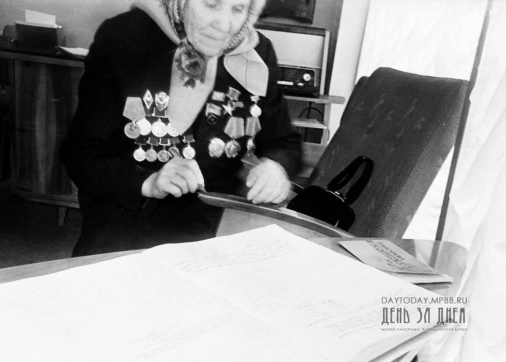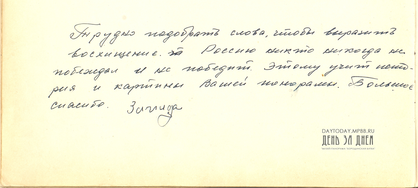 В конце апреля 1963 года Надежда Григорьевна Заглада приехала в Москву для участия во Всесоюзном совещании передовиков движения за коммунистический труд. А 28 апреля посетила Музей-панораму «Бородинская битва». После экскурсии Надежда Григорьевна сделала запись в Книге Почётных Гостей.