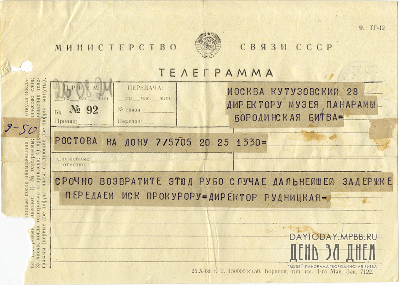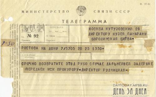 «В связи с Вашим категорическим требованием о немедленном возврате этюда Ф.А. Рубо «Кавалеристы», мы были вынуждены обратиться в Министерство культуры РСФСР за содействием в продлении срока нахождения этого произведения в экспозиции Музея-панорамы «Бородинская битва».