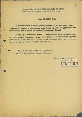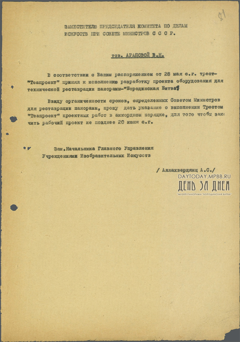 Письмо А.С. Аллахвердянца В.Н. Араповой о разработке проекта оборудования для технической реставрации панорамы «Бородино» в аккордном порядке