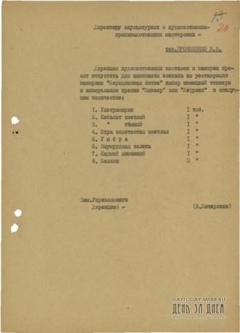 Письмо заместителя управляющего Дирекцией художественных выставок и панорам В.С. Бачерикова директору Скульптурных и художественно-производственных мастерских И.В. Прокопенко с просьбой выделить набор немецкой краски для написания эскизов по панораме