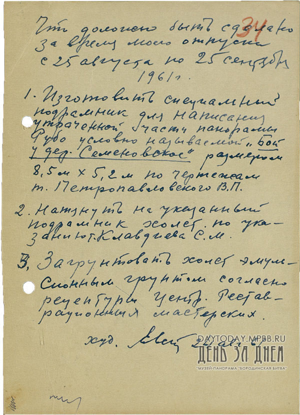 Записка главного художника панорамы И.В. Евстигнеева с заданием, что нужно сделать сотрудникам за время его отпуска